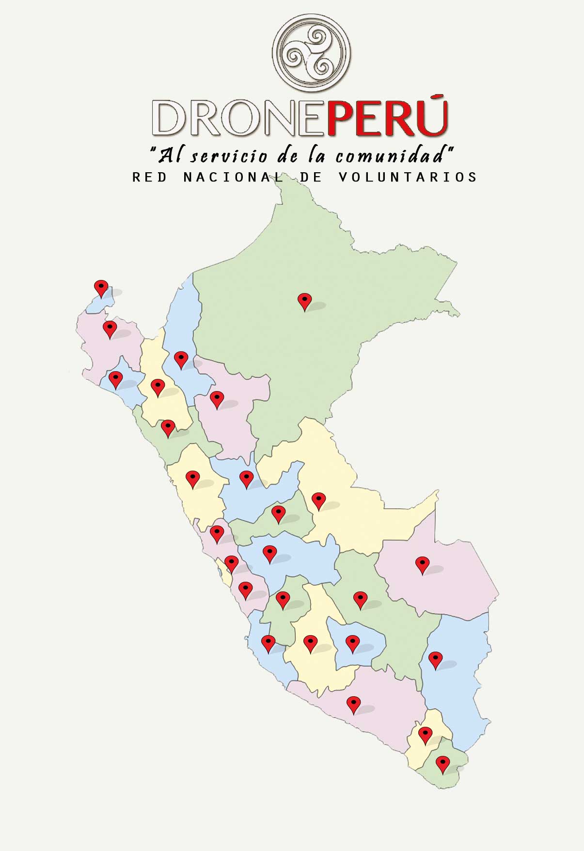 Nuestra primera acción consiste en crear un mapa virtual integrado a una red nacional de propietarios de drones dispuestos a participar en vuelos solidarios de apoyo al Cuerpo General de Bomberos Voluntarios del Perú, el Instituto Nacional de Defensa Civil (INDECI) y nuestras municipalidades distritales y provinciales en caso de emergencia.